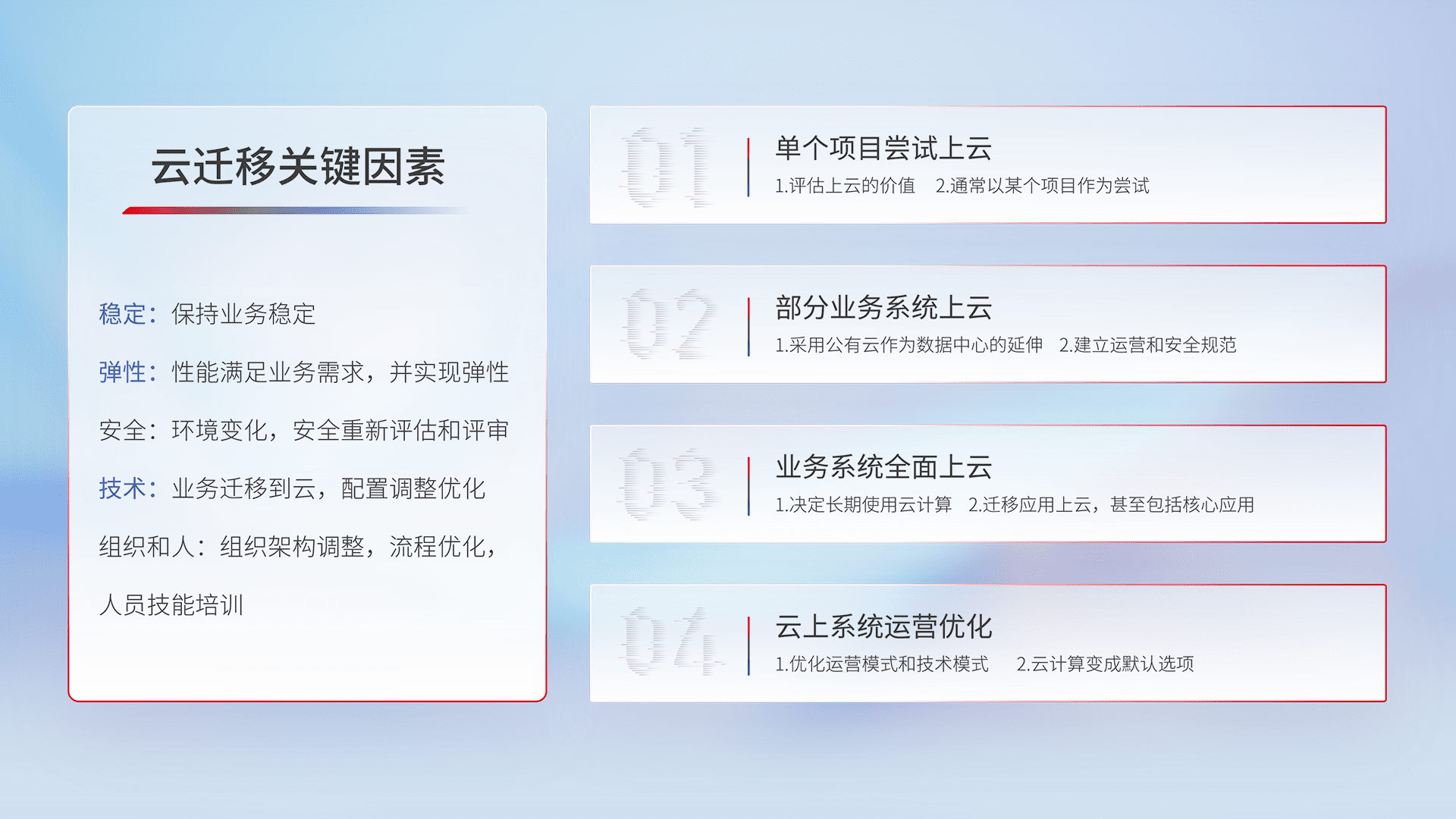 结合实际业务,,,从规划设计、、、、云平台选型、、、云原生改造、、数据迁移、、、集成交付,,,,迁移全过程为客户识别最佳上云路径,,,,做好风险识别管理,,设计网络架构、、、、身份权限、、、安全审计合规、、操作审计、、、日志审计、、、监控告警策略、、、多站点容灾设计等,,对云上基础设施进行整体规划,,,提升IT治理水平,,以满足弹性、、、、高可用、、、、高性能的需求。。。