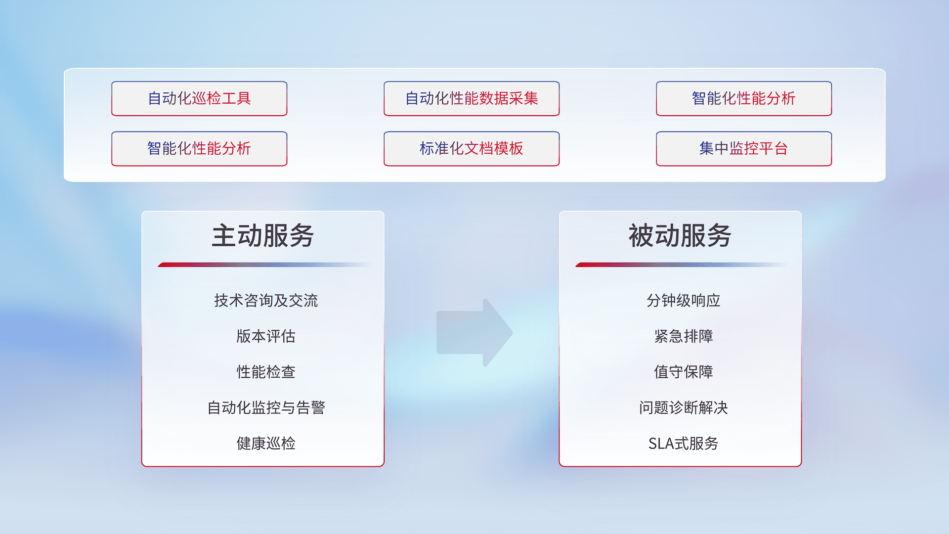 智能化工具和标准化文档,,保障服务质量,,提供主动服务(包含技术咨询、、、版本评估、、、性能检查、、、、自动化监控与告警、、、健康巡检)和被动服务包含(分钟级响应、、、、紧急排障、、、、值守保障、、、问题诊断解决、、SLA服务)。。。。